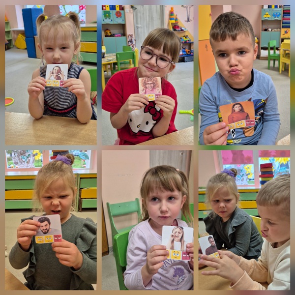 Toliau žaidėme žaidimą su emocijų kortelėmis. Vaikai traukė korteles, rodė emociją veidu arba bandė ją atspėti pagal draugo išraišką. Šis žaidimas sukėlė daug juoko ir padėjo vaikams pamatyti, kad jausmus galima išreikšti ne tik žodžiais, bet ir mimika bei kūno kalba.