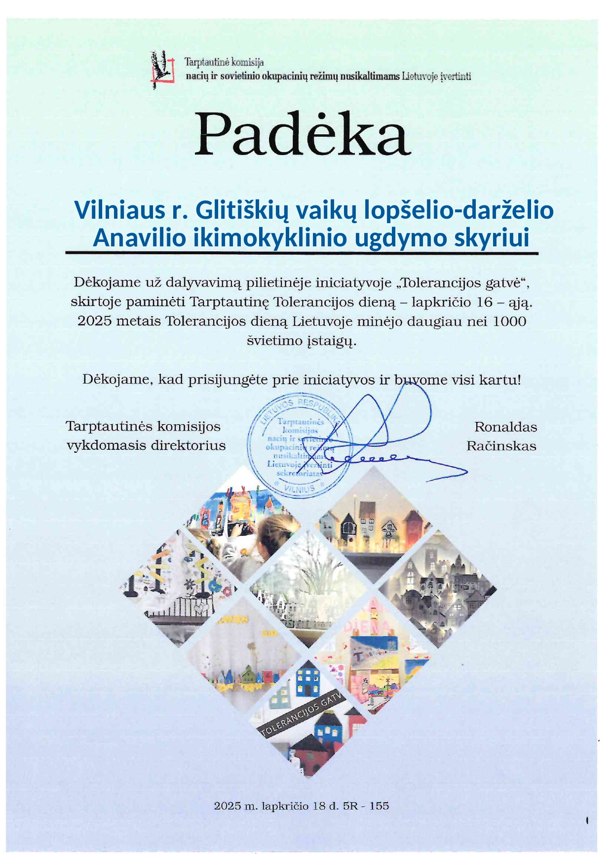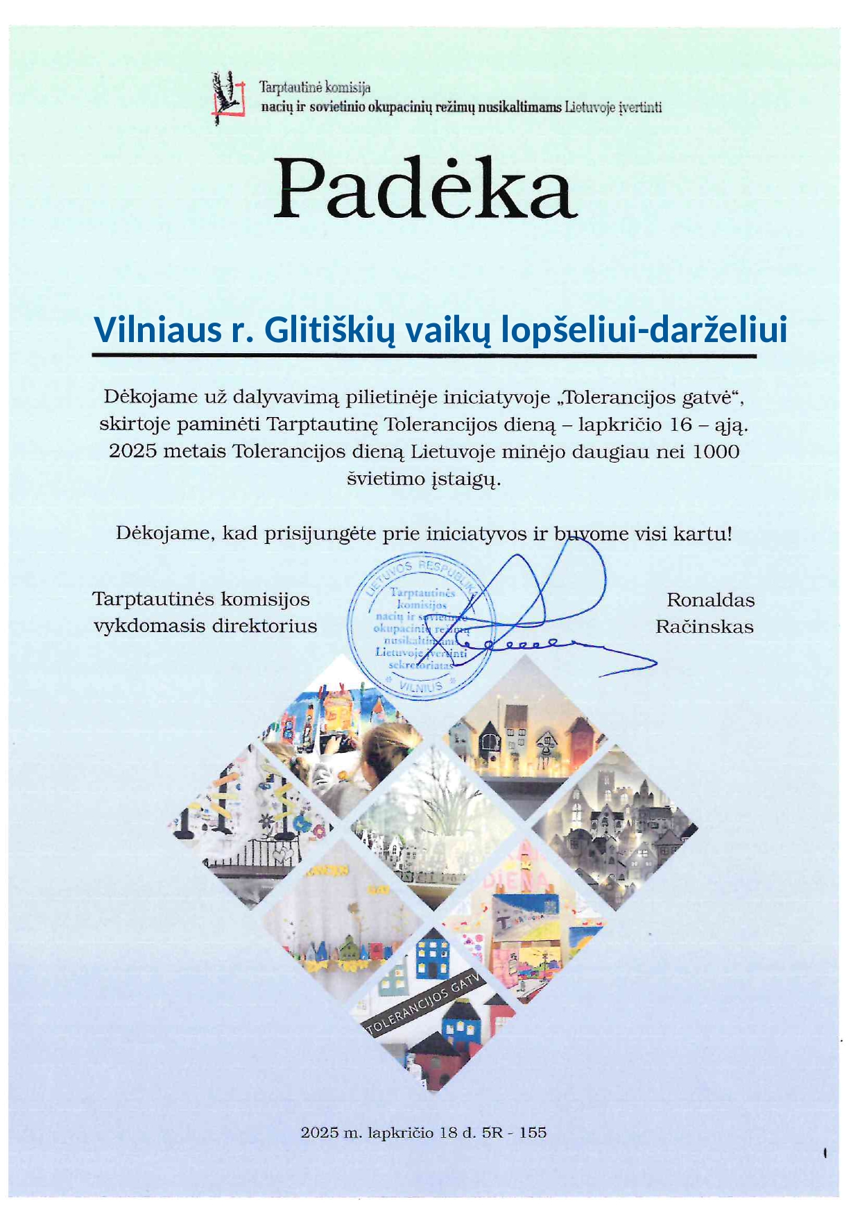 Šios veiklos padėjo vaikams suprasti, kad tolerancija prasideda nuo mažų dalykų: šypsenos, pagalbos, gero žodžio, supratimo. Sukurta Tolerancijos gatvė – tai tarsi mūsų darželio bendruomenės atspindys: spalvinga, įvairi, draugiška ir atvira visiems.