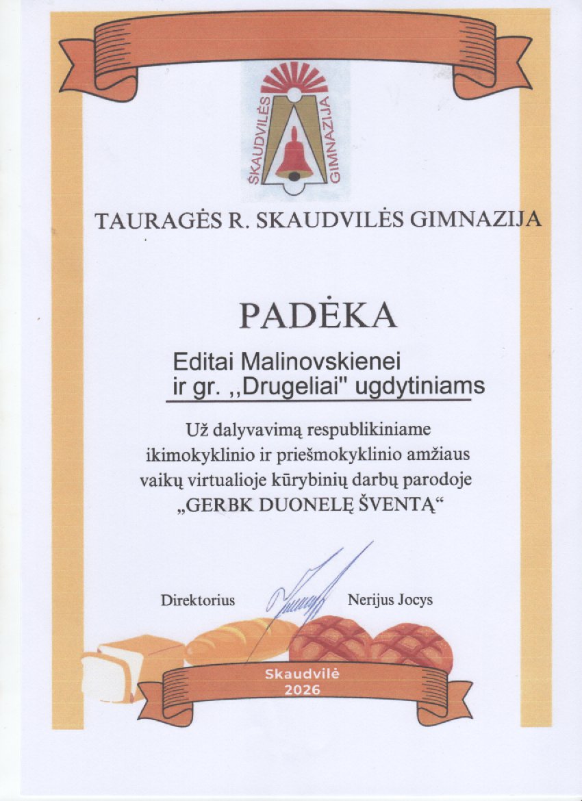 Duona – tai ne tik kasdienis maistas, bet ir gilias tradicijas bei simbolinę prasmę turintis lietuvių kultūros paveldas. Nuo seno duona buvo laikoma šventa, gerbiama ir tausojama – ji simbolizavo gyvybę, namų gerovę, bendrystę ir darbštumą. Duonos kelias – ilgas ir prasmingas procesas: nuo mažo grūdo pasėjimo, jo auginimo ir brandinimo iki šilto, kvepiančio kepalo ant šeimos stalo. Puoselėjant pagarbą duonai nuo pat mažens, vaikams ugdomos atsakomybės, dėkingumo už darbą ir pagarbos tradicijoms vertybės. Kūrybinės ir pažintinės veiklos duonos tema leidžia vaikams ne tik pažinti duonos atsiradimo kelią, bet ir patirti džiaugsmą kuriant, bendradarbiaujant bei dalijantis savo darbais su kitais.